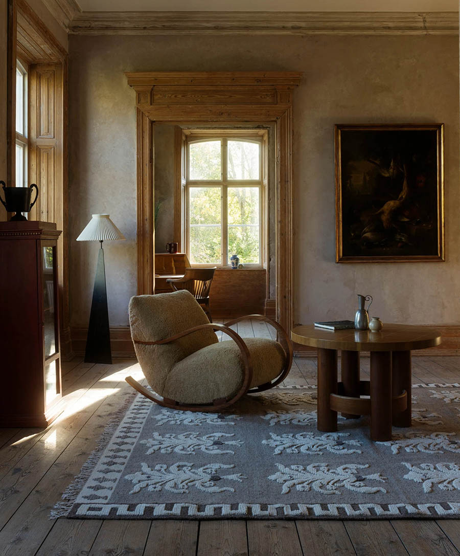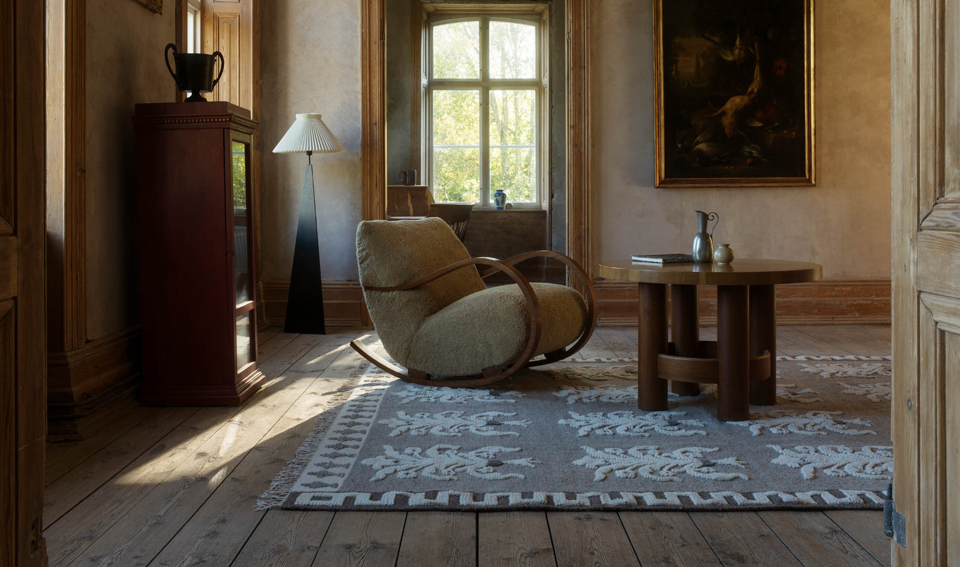 Takpendeln Ampio i det vackra tyget Torno från svenska Astrid Textiles. Tygets ull- och linbouclé bjuder in till beröring med sin levande struktur och varma karaktär.