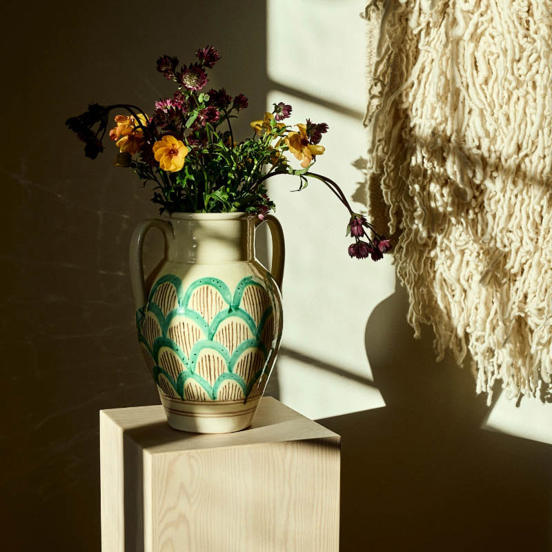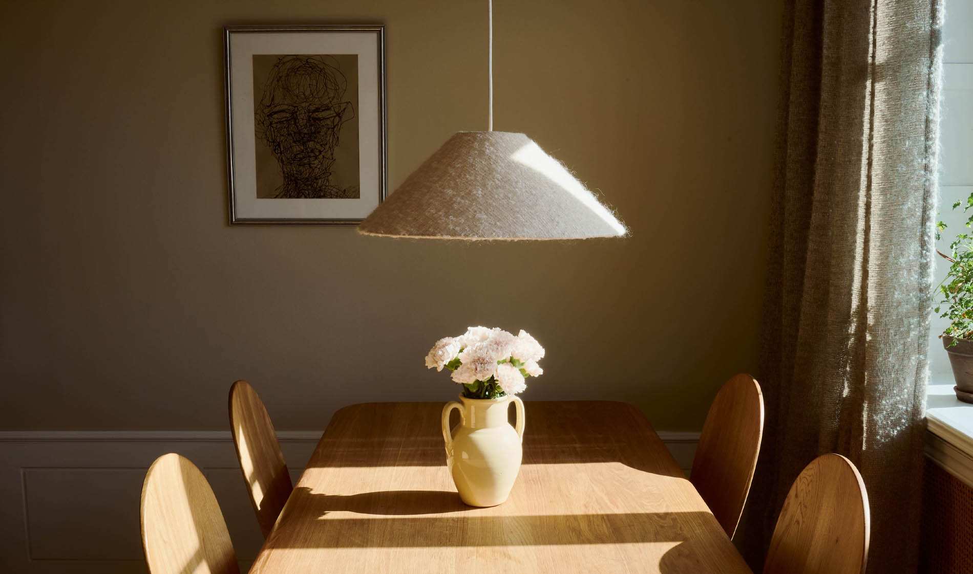 Takpendeln Ampio i det vackra tyget Torno från svenska Astrid Textiles. Tygets ull- och linbouclé bjuder in till beröring med sin levande struktur och varma karaktär. Resultatet är en lampa där ljus, textil och hantverk möts i perfekt balans.