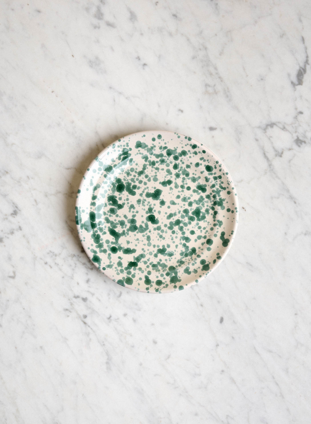 "Spruzzi" är ett italienskt ord som betyder "stänk" på svenska. Stänkmålat porslin är en hantverkstradition som är typisk för regionen Puglia i Italien. Denna teknik innebär att färgen slumpmässigt stänks på keramiken för att ge den en unik och individuell karaktär. Den traditionella tekniken har blivit en viktig del av regionens kulturella arv och representerar en lång historia av keramiktillverkning i området. Spruzzi Muschio har stänkmålats i en mossgrön nyans som ger varje dukning en livlig, färgglad och dekorativ karaktär.
