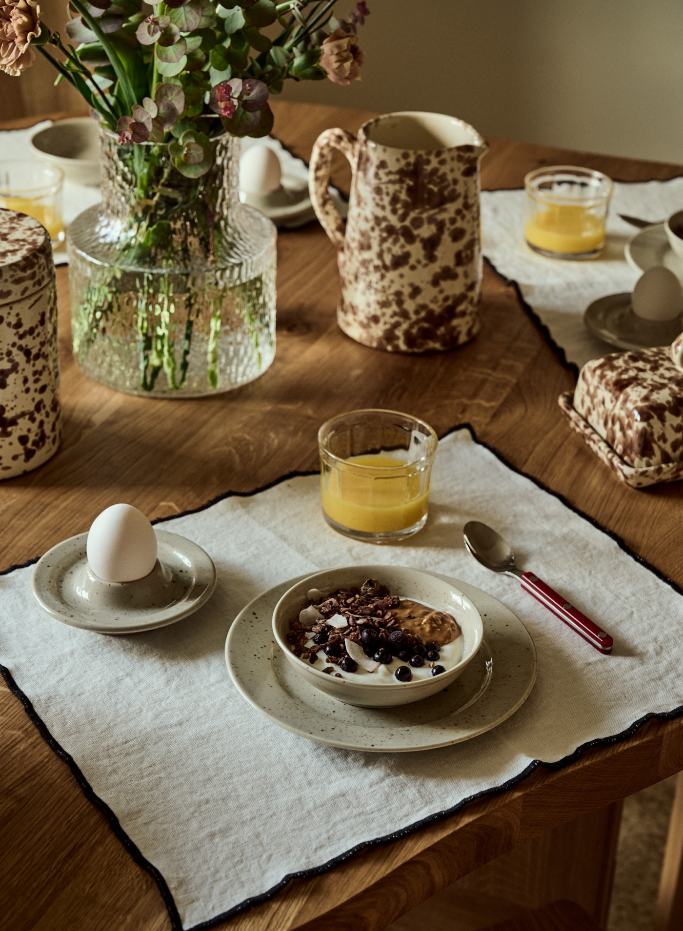 Varje produkt är unik, tack vare en tillverkningsprocess där järnspån tillsätts i glasyren. Detta skapar det karaktäristiska prickiga mönstret och bidrar till dess slitstarka kvalitet. Subtila variationer i både färg och mönster kan förekomma, vilket är en naturlig del av hantverket.