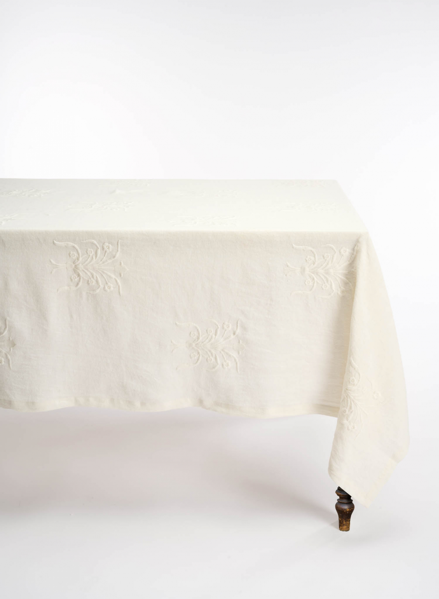 Floral-duken skapar en varm, elegant atmosfär vid både vardagliga måltider och festliga tillfällen. Den sobra designen och den broderade blomman gör den till en mångsidig och stilfull pjäs att återvända till år efter år.
