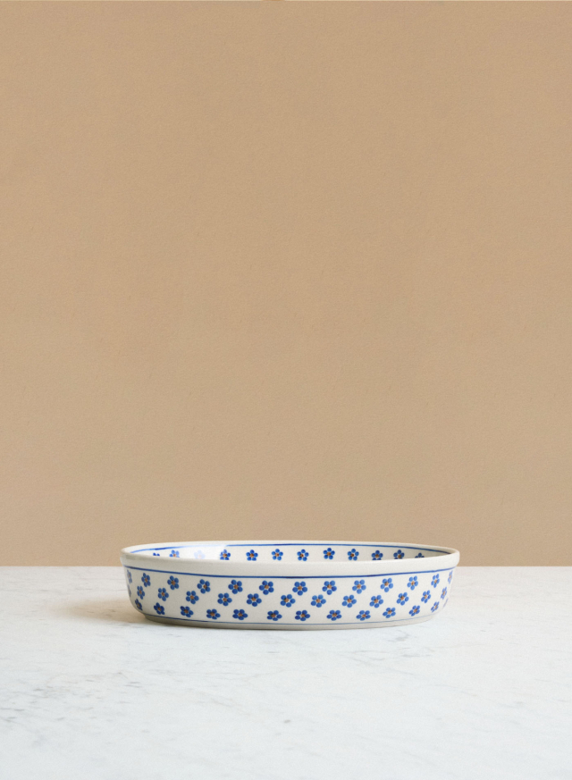 Ugnsfast gratängform i stengods från polska Ceramika Artystyczna, kända för sitt gedigna hantverk och sina vackra, handmålade mönster. Det handmålade blommönstret ger formen ett dekorativt och inbjudande uttryck.