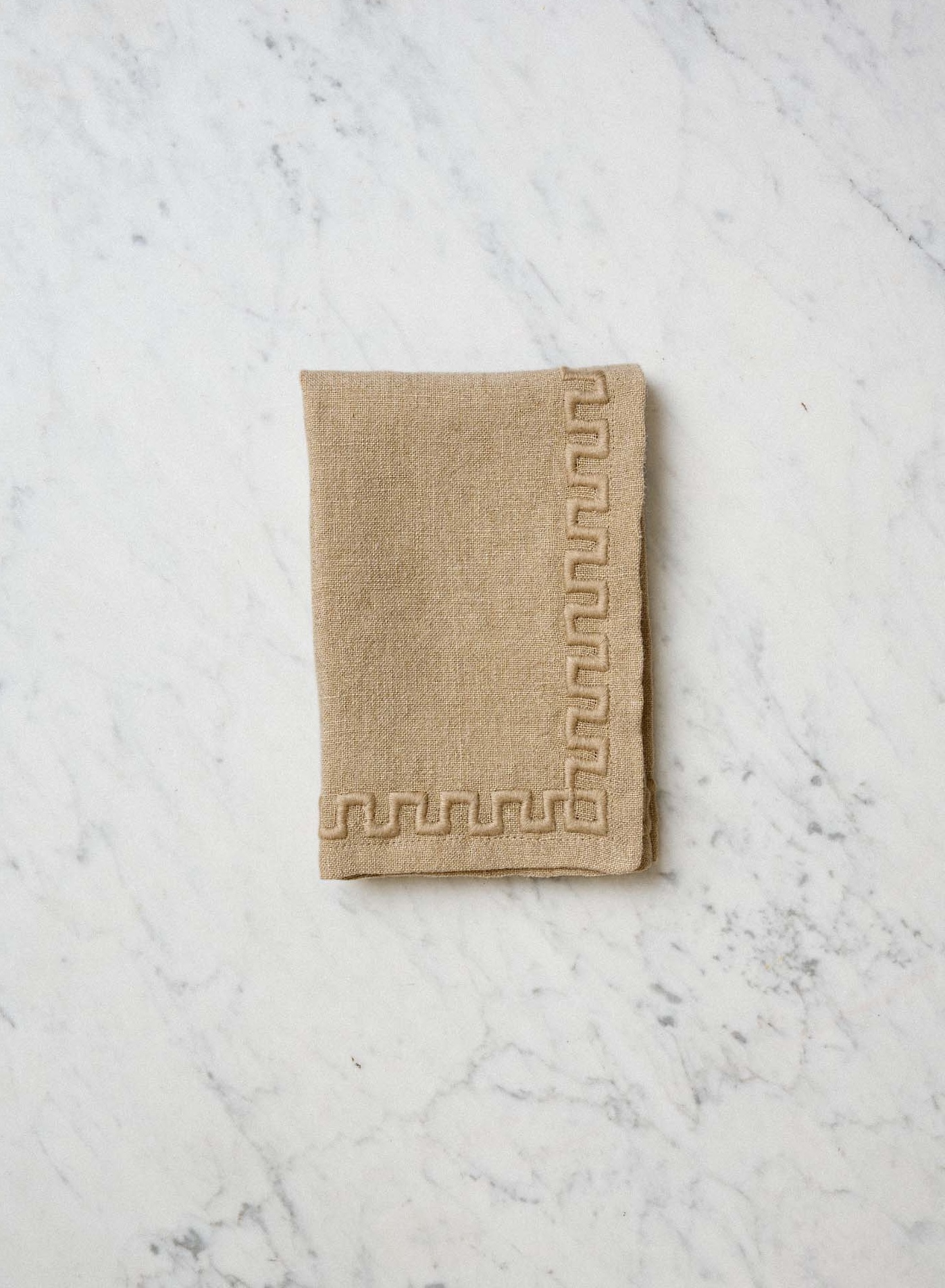 Bordsservetten Frame i Beige linne från Cappelen Dimyr är tillverkad i 100 % linnetyg och dekorerad med en diskret, broderad bård i ett klassiskt grekiskt meandermönster. Den taktila brodyren ger servetten en subtil struktur och ett elegant uttryck som tillför karaktär till det dukade bordet.