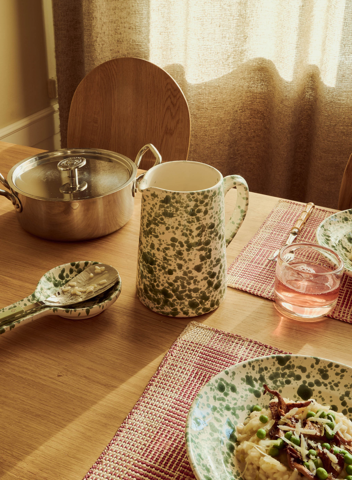 "Spruzzi" är ett italienskt ord som betyder "stänk" på svenska. Stänkmålat porslin är en hantverkstradition som är typisk för regionen Puglia i Italien. Denna teknik innebär att färgen slumpmässigt stänks på keramiken för att ge den en unik och individuell karaktär. Den traditionella tekniken har blivit en viktig del av regionens kulturella arv och representerar en lång historia av keramiktillverkning i området. Spruzzi Muschio har stänkmålats i en mossgrön nyans som ger varje dukning en livlig, färgglad och dekorativ karaktär.