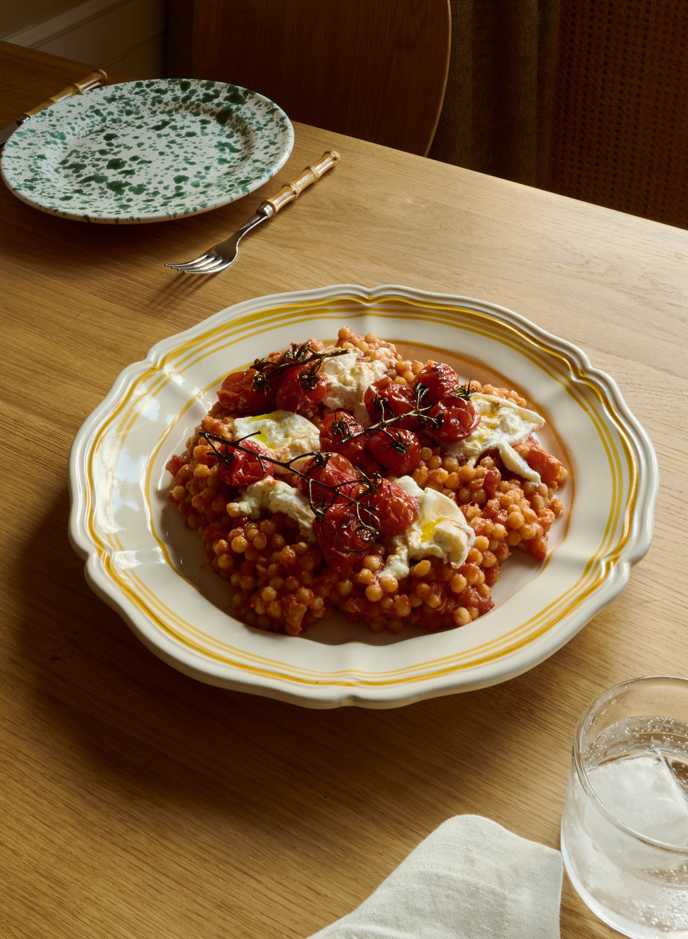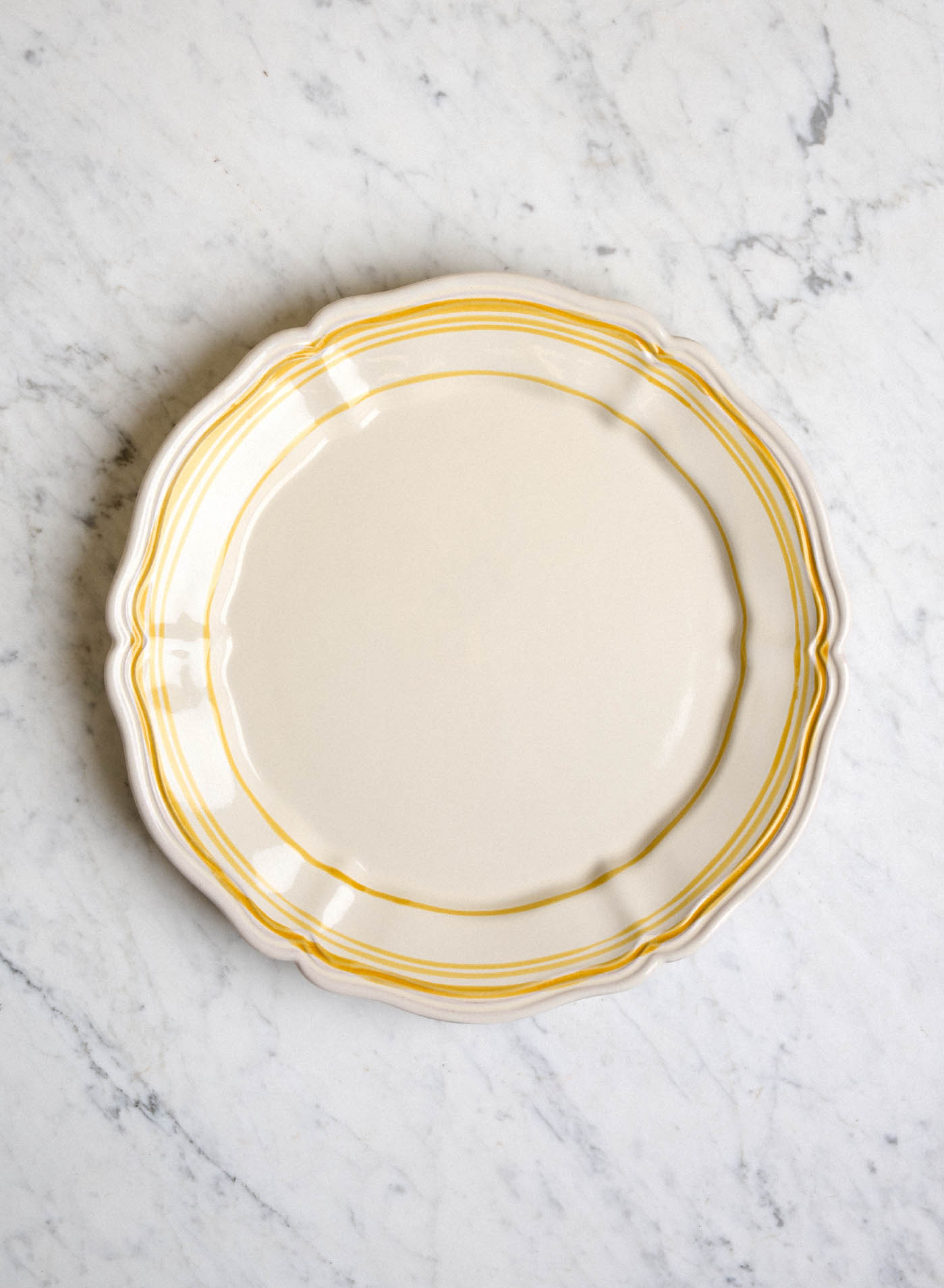 Serien Baccellato har en charmig men samtidigt tidlös formgivning. Den vågiga och mjuka kanten ramar noggrant in det som serveras. Serien finns i olika varianter av handmålade ränder i mörkgrön, verde och en varm solgul nyans, Solare.