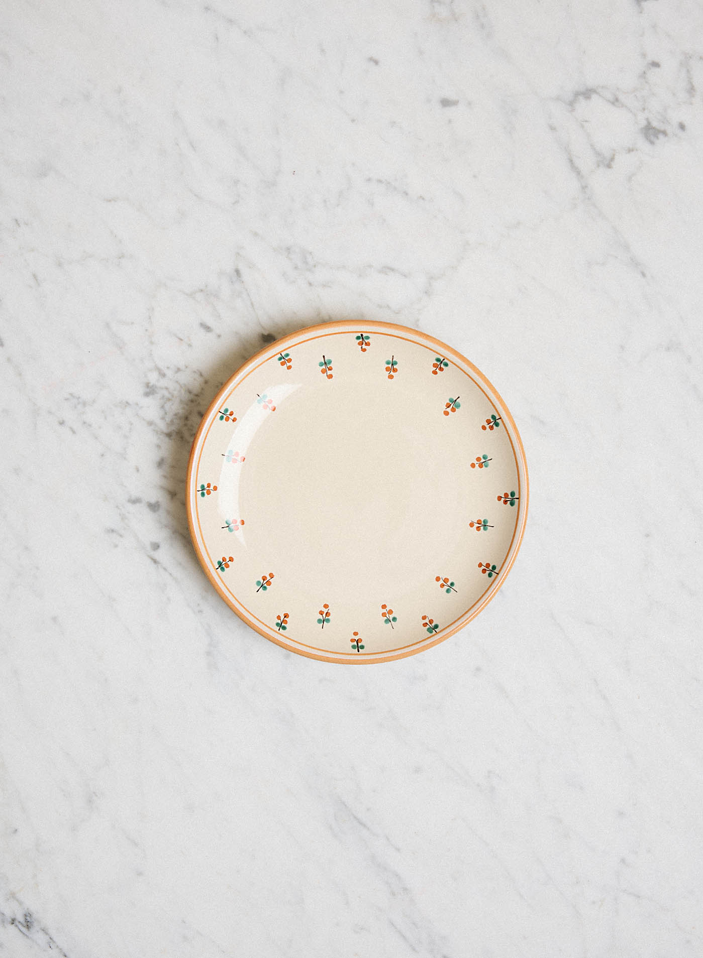 Fiore, som betyder blomma på italienska, är en serie av porslin med små handmålade blommor i en varm orange färg. En bredare och en smalare rand ramar in de dekorativt handmålade små blommorna i samma orange nyans som blommorna. Det tidlösa porslinet för tankarna till en frodig trädgård och tillför en romantisk touch. Fiore är vackert som en hel serie, men även som ett tillägg till andra serier för att skapa en livfull dukning. Blomstermönstret blir en vacker och dekorativ detalj i din dukning.