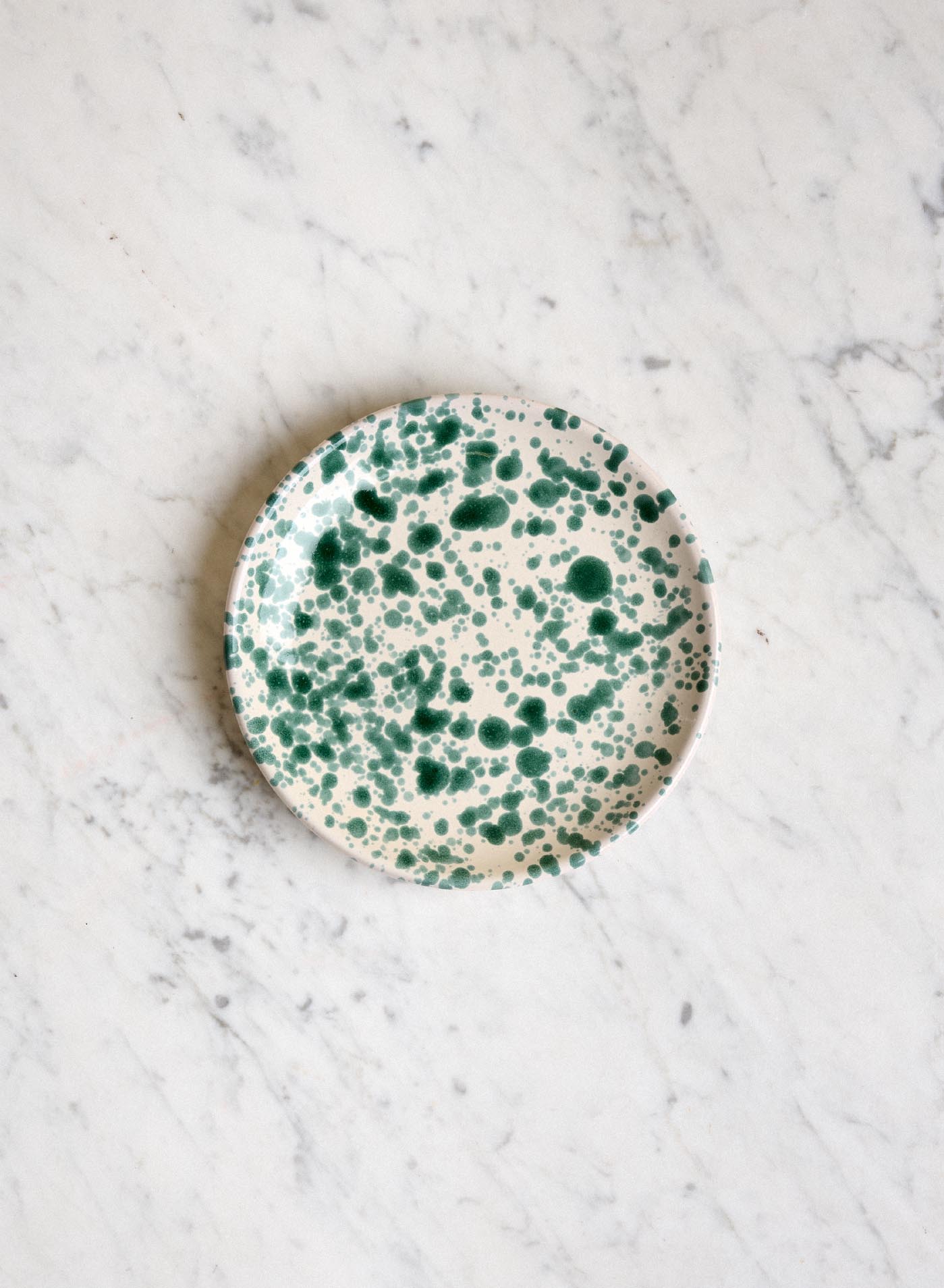 "Spruzzi" är ett italienskt ord som betyder "stänk" på svenska. Stänkmålat porslin är en hantverkstradition som är typisk för regionen Puglia i Italien. Denna teknik innebär att färgen slumpmässigt stänks på keramiken för att ge den en unik och individuell karaktär. Den traditionella tekniken har blivit en viktig del av regionens kulturella arv och representerar en lång historia av keramiktillverkning i området. Spruzzi Muschio har stänkmålats i en mossgrön nyans som ger varje dukning en livlig, färgglad och dekorativ karaktär.