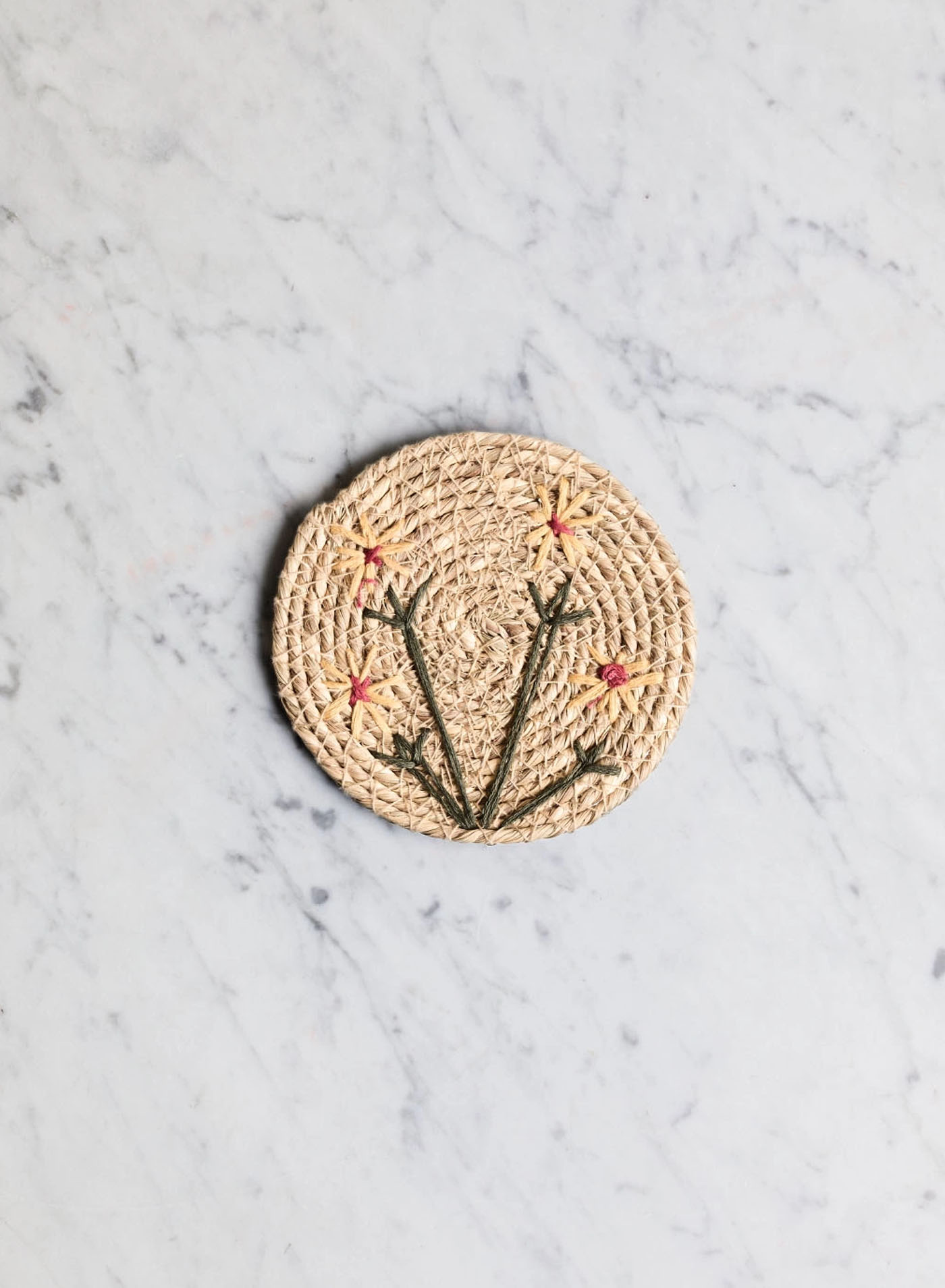 Tillverkat i naturfiber med traditionellt hantverk, vilket gör varje exemplar unikt. Ett funktionellt och dekorativt inslag som sprider både värme och sommarkänsla på bordet.