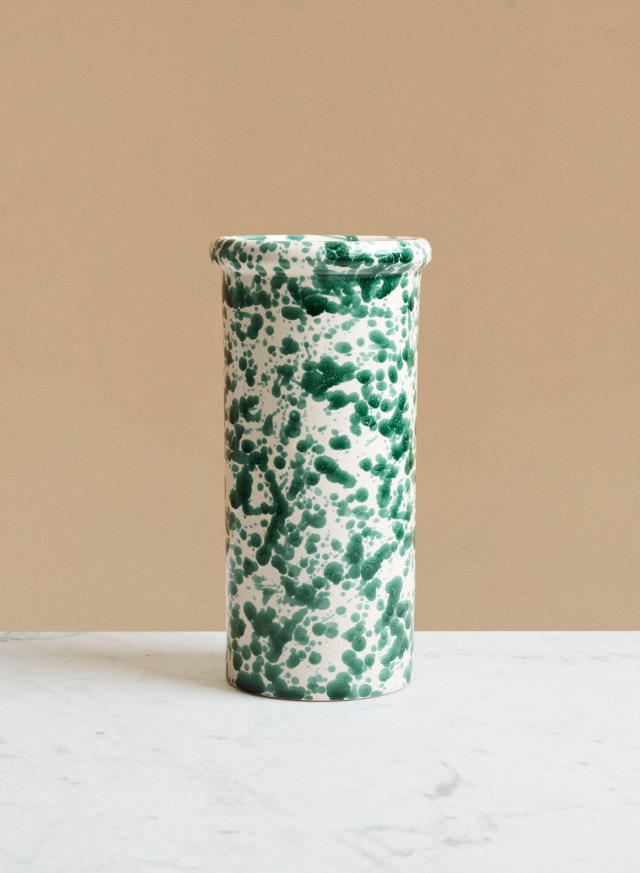 "Spruzzi" är ett italienskt ord som betyder "stänk" på svenska. Stänkmålat porslin är en hantverkstradition som är typisk för regionen Puglia i Italien. Denna teknik innebär att färgen slumpmässigt stänks på keramiken för att ge den en unik och individuell karaktär. Den traditionella tekniken har blivit en viktig del av regionens kulturella arv och representerar en lång historia av keramiktillverkning i området. Spruzzi Muschio har stänkmålats i en mossgrön nyans som ger varje dukning en livlig, färgglad och dekorativ karaktär.